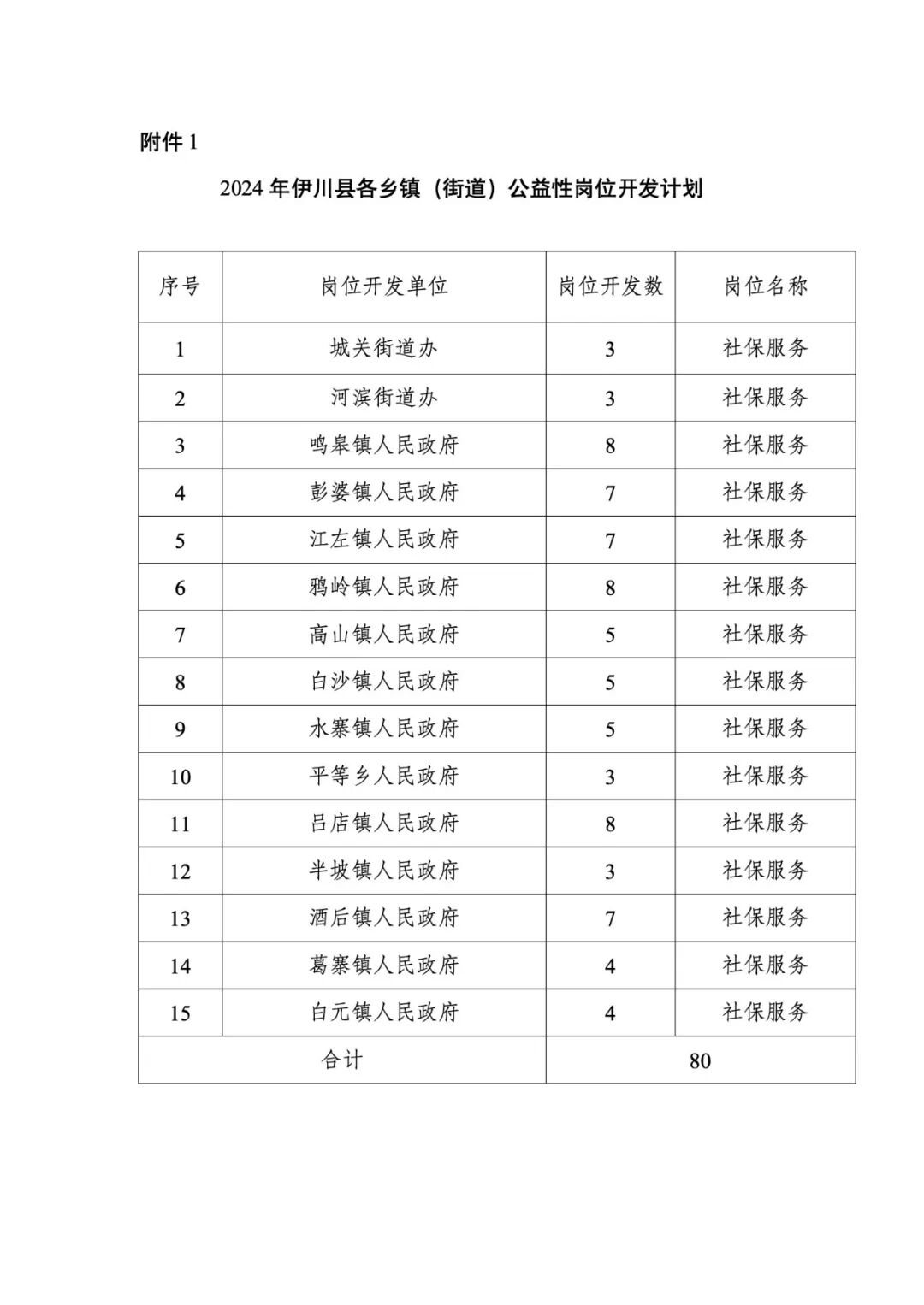 2024年伊川县各乡镇(街道)公益性岗位开发计划